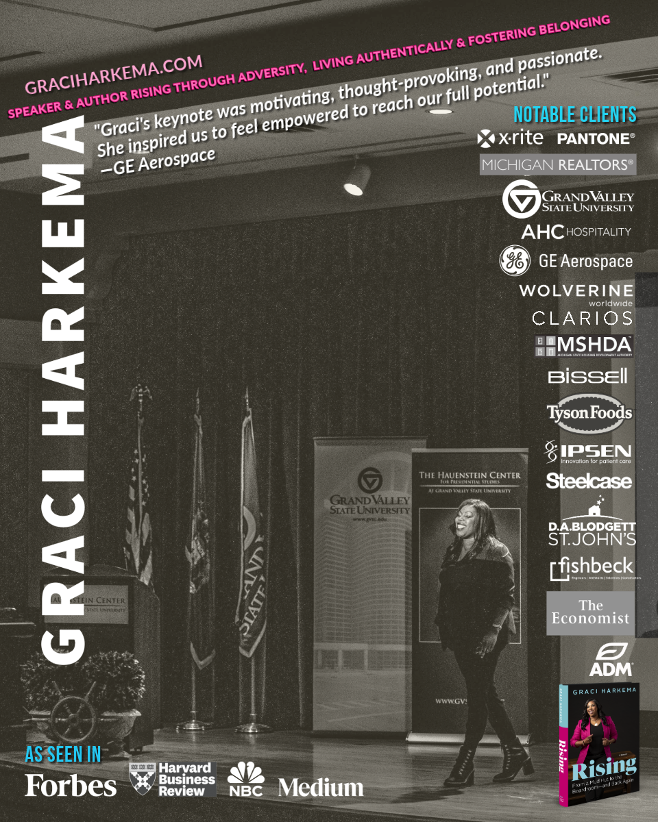 Graci Harkema, inspirational speaker and best-selling author, inspiring all to rise through adversity, live authentically, and foster belonging.