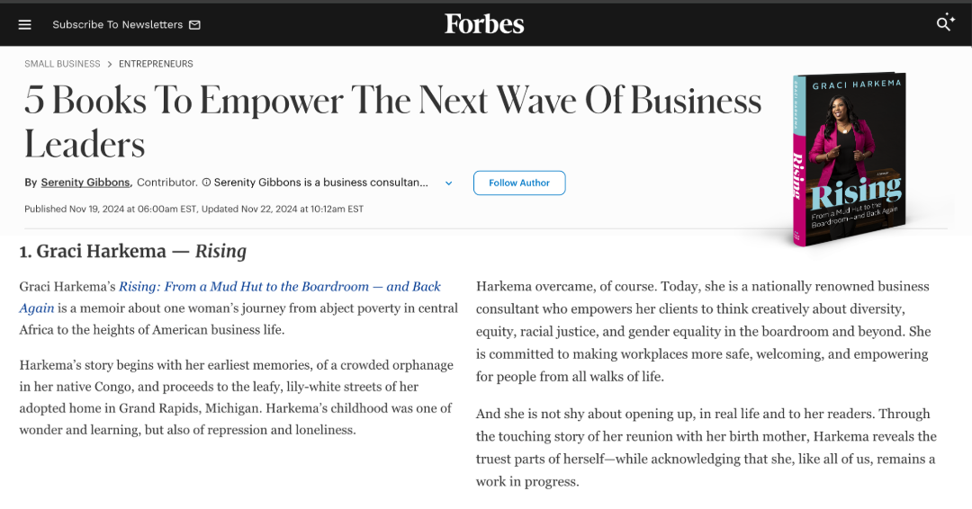 Graci Harkema is an international, inspirational speaker and author of her memoir, Rising: From a Mud Hut to the Boardroom—and Back Again. Harkema's work with Fortune 500 companies to small organizations inspires all to rise through adversity, live and lead authentically, and foster belonging. Born in a mud hut with a slim chance of survival, amidst civil unrest in the Congo, Harkema’s life began with rising through adversity. After having a life expectancy of 12-24 hours, through divine intervention, Harkema was adopted and had the opportunity of survival. While continuing to rise through uncertainty, she learned how to live more authentically, while fostering belonging within herself and in the world around her.